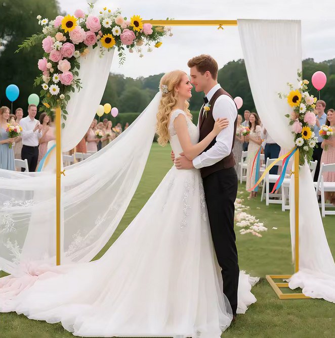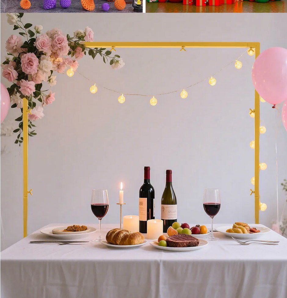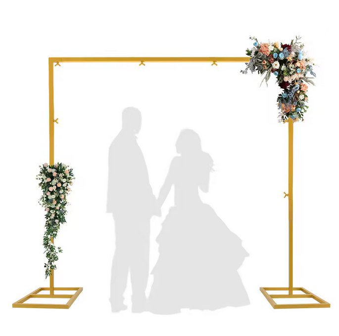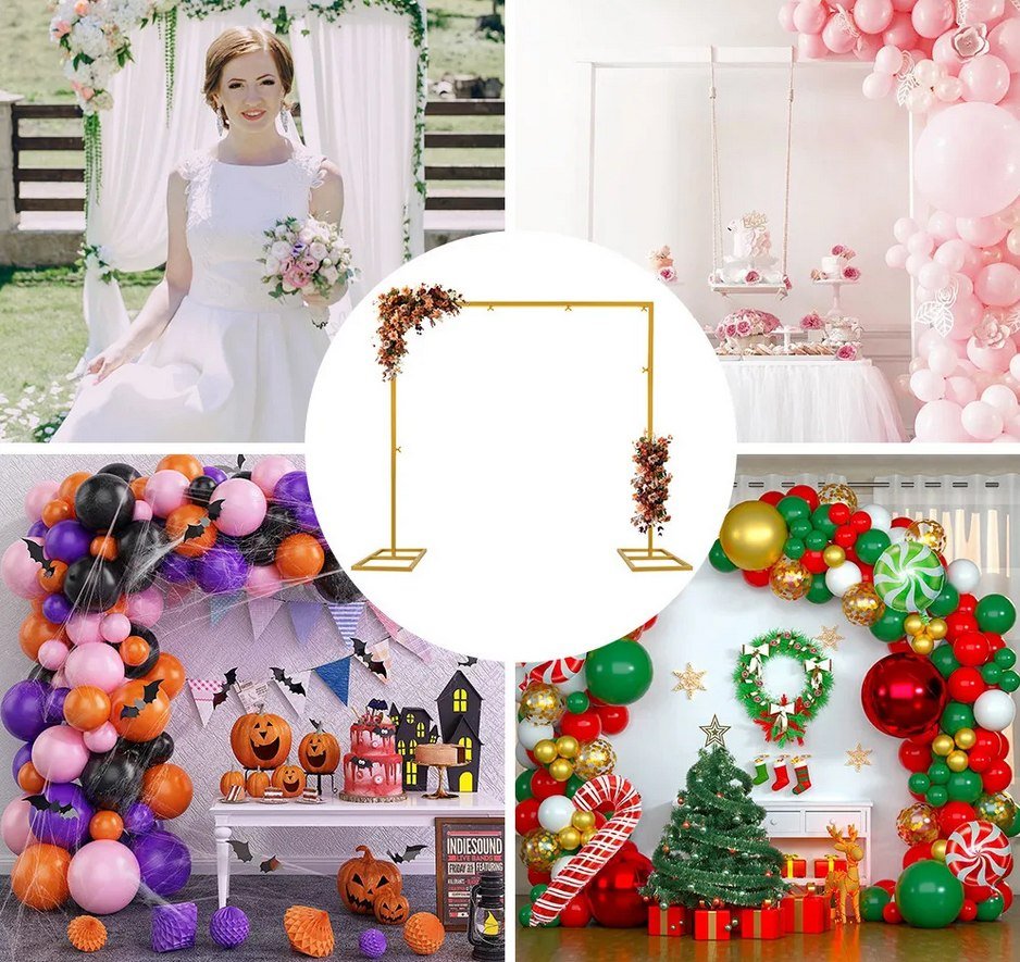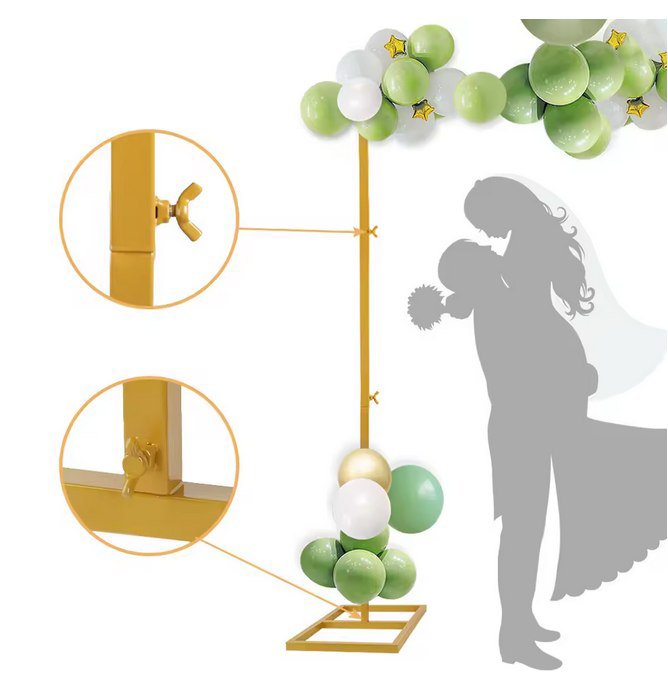 Pastaba: nuotraukose pavaizduotos dekoracijos (balionai, gėlės, audiniai ir kt.) į komplektą neįeina – parduodamas tik stovo rėmas su priedais.