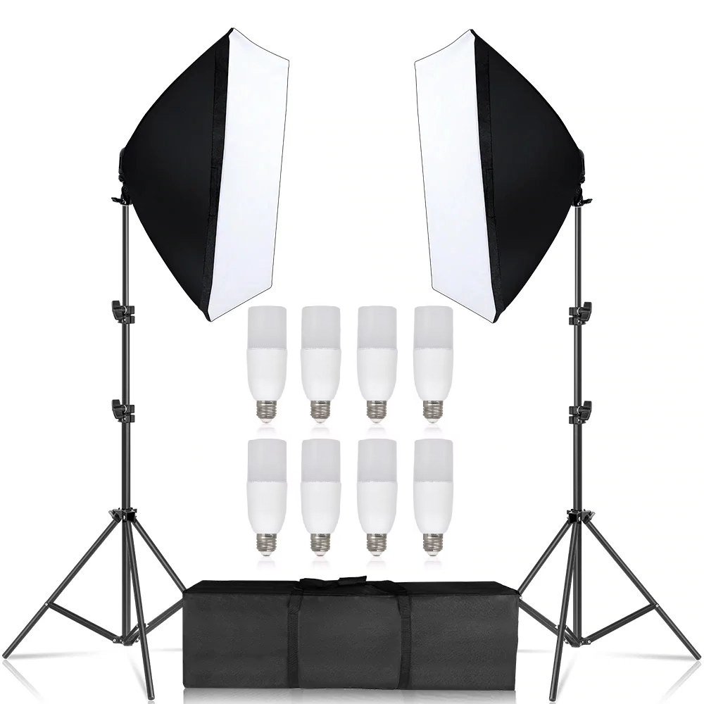 Naujas pastovios šviesos apšvietimo rinkinys. Tinkamas naudoti įvairioms fotosesijoms, skleidžia daug šviesos, o norint kitokio šviesos srauto galima sukti ir kitas lemputes su E27 cokoliu.