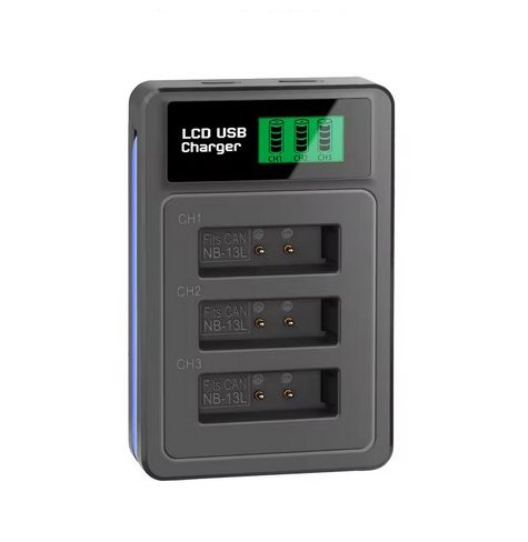 Naujas Canon akumuliatorių kroviklis NB-13L NB-12L – tinka krauti įvairias baterijas. Vienu metu galima krauti net tris akumuliatorius. Tinka originaliems, ir ne originaliems akumuliatoriams.