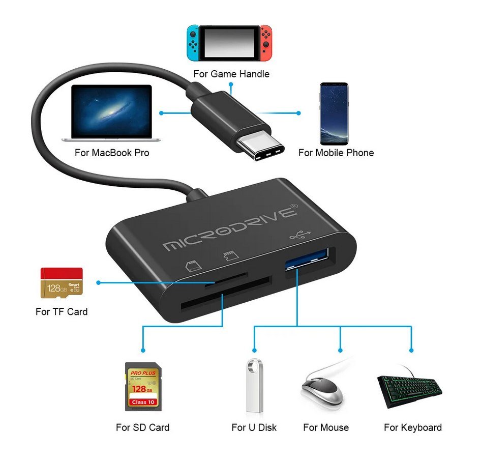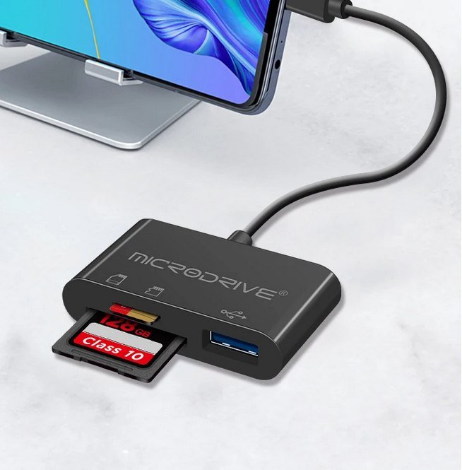 Naujas kortelių skaitytuvas Microdrive su Type-C antgaliu. Tinka naudoti norint iškelti duomenis iš SD, SDHC, micro SD kortelių ir USB.