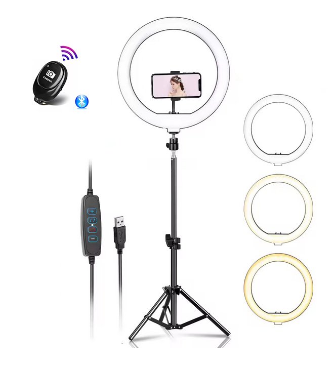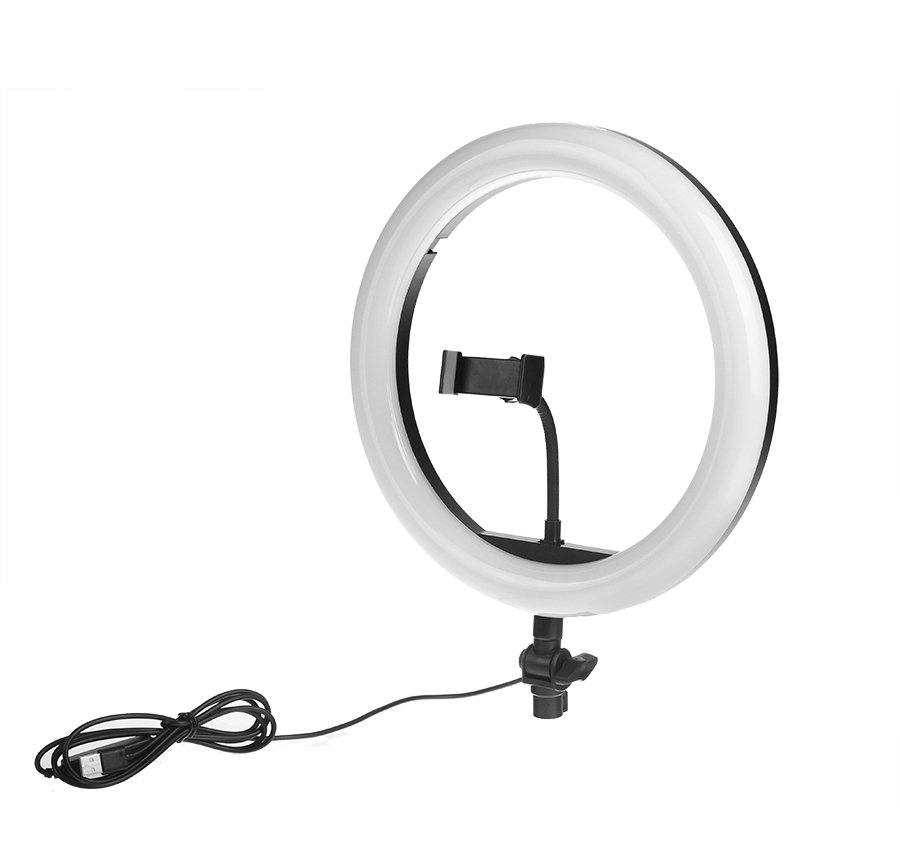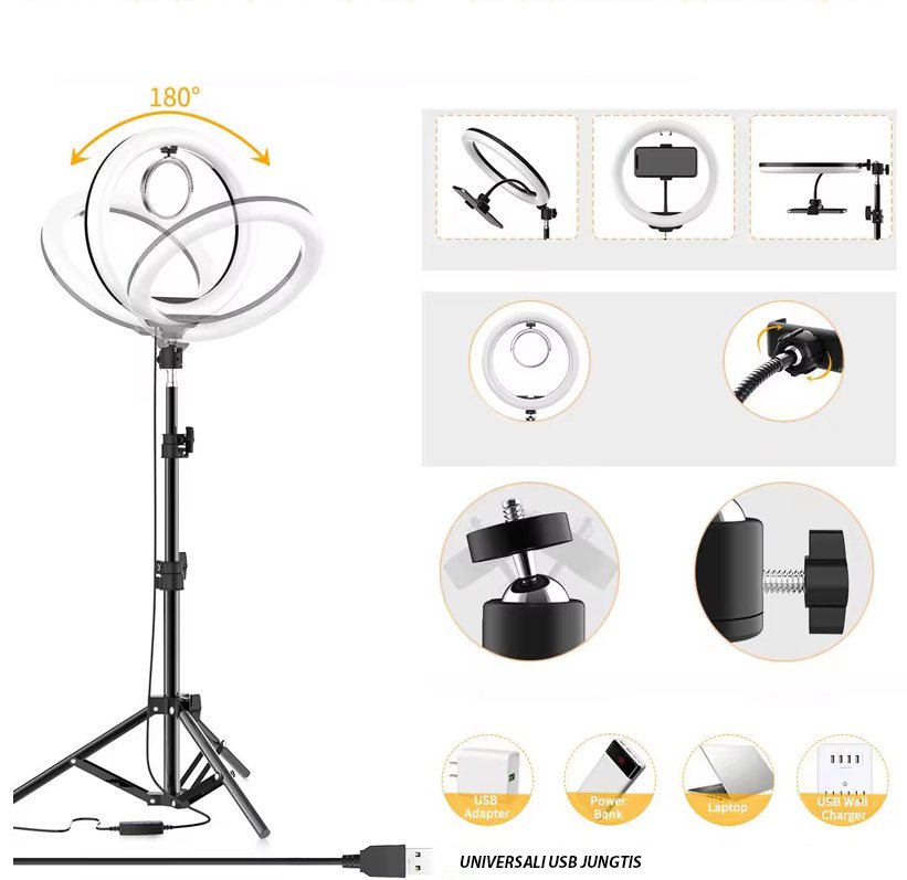 Profesionali 32 cm skersmens Žiedinė LED lempa su telefono laikikliu ir trikoju stovu – „MAXI“ – tai aukštos klasės šviestuvas nuotraukoms, asmenukėms (selfies), TikTok’ų arba video blogų filmavimui, tiesioginiam transliavimui ar kitam turiniui kurti.