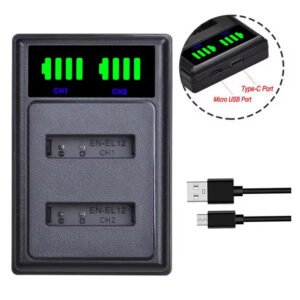 Nikon Coolpix AW100, AW100s, AW110, AW120, W300,B600,P330, P340, S1000pj, S1100pj, S1200pj, S31, S6000, S610, S610c, S6150, S620, S6200, S630, S640, S70, S710, S8000, S800c, S8100, S8200, S9400, S9500, S9600, S9700 ir kitais su En-el12 baterija.