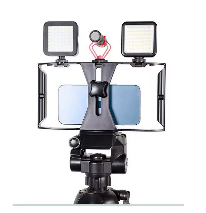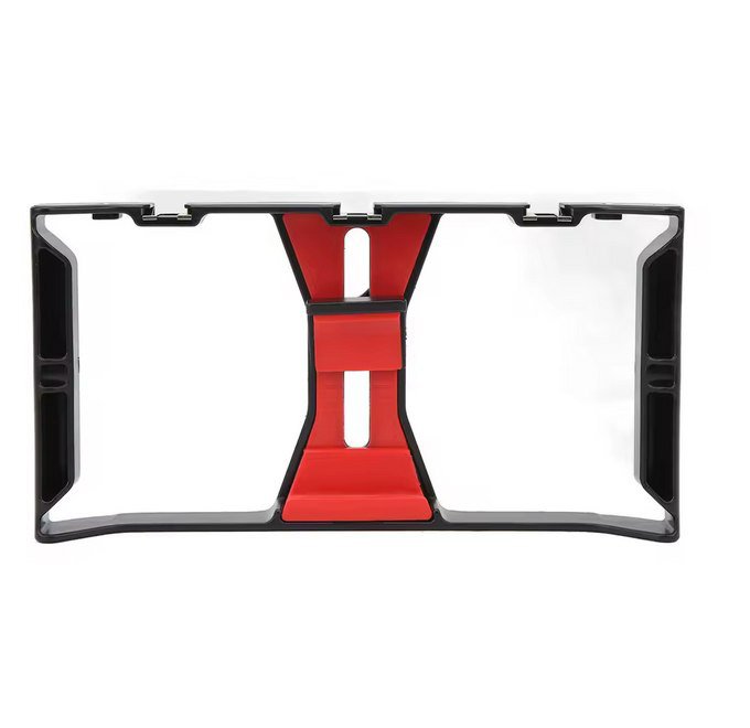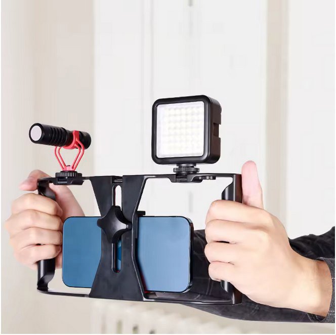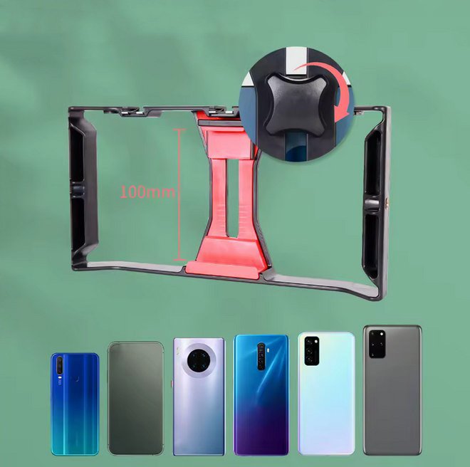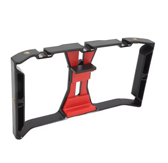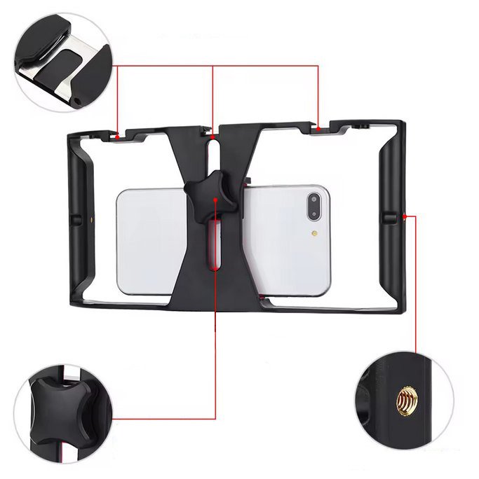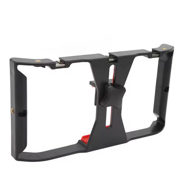 Rankinis telefono stabilizatorius su dviem rankenomis ir reguliuojamu universaliu laikikliu. Laikiklyje yra net penkios cold shoe jungtys (dvi viršuje, po vieną šonuose ir apačioje), kuriuose galima tvirtinti apšvietimą, mikrofoną ar kitus laikiklius, pvz. papildomą telefoną ar veiksmo kamerą. Taip pat viršuje yra dvi 1/4 sriegio jungtys, taip pat yra ir apačioje, tad laikiklį galima tvirtinti ir ant trikojų stovų.