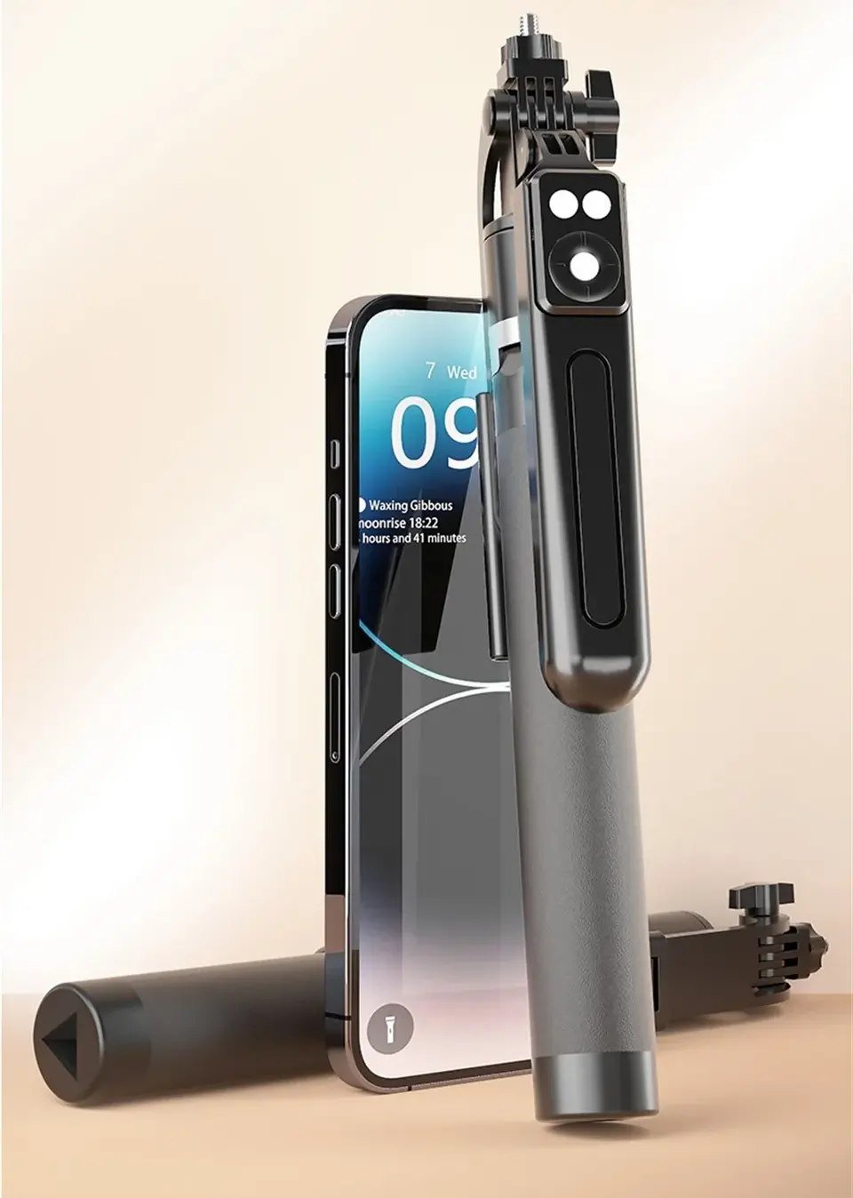 Pridedamas ir Bluetooth nuotolinis pultelis, kuris nesudėtingai suderinamas su visais telefonais Bluetooth ryšiu. Tinka ir Android, ir IOS (Apple) naudojantiems telefonams. Pultelio veikimo atstumas iki 10 metrų. Baterija CR2032 komplekte pridedama nemokamai.