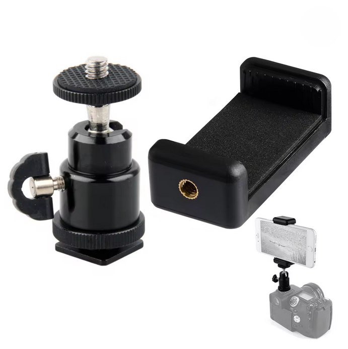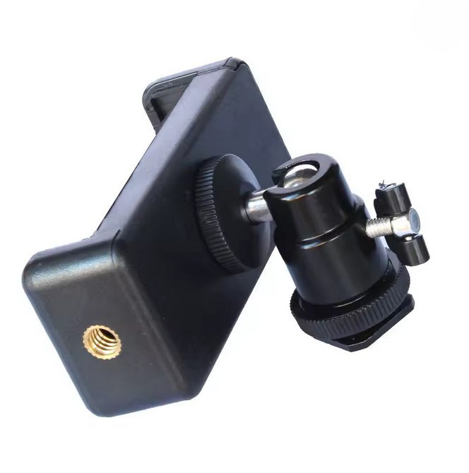 Universalus telefono laikiklis su standartiniu 1/4″ varžto lizdu ir „hot shoe“ jungtimi, tinkantis įvairiai fotografinei įrangai. Jį galima naudoti su mobiliaisiais telefonais, fotoaparatais, papildomu apšvietimu, blykstėmis ir kitais priedais.